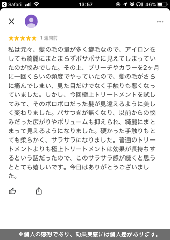 少しうねりがちな髪質でしたが、しっかりとトリートメントを繰り返すことでハリとコシが生まれて改善されていきました。